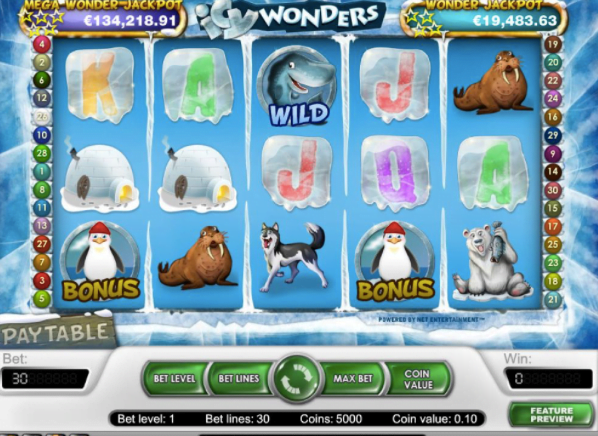 Net entertainment’s Icy Wonders offers casino gamers a 30 pay line slot inspired by life in the Arctic. Various arctic animals spin across reels with a wild symbol prized as a whale and an Eskimo maiden acting as the scatter trigger. The slot features outstanding graphics with bet values starting at a respectable £0.20 per spin upwards to £24.00 per spin. There also is a progressive jackpot that can only be won outside of any bonus gameplay making Icy wonders great casino slot for experiencing solid online casino slot game play.